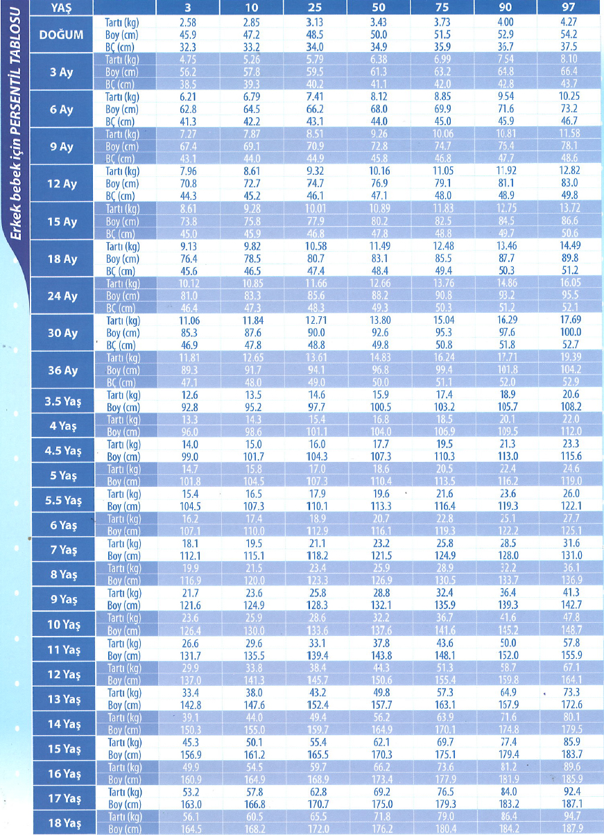 Erkek Çocuklar İçin Persentil Tablosu